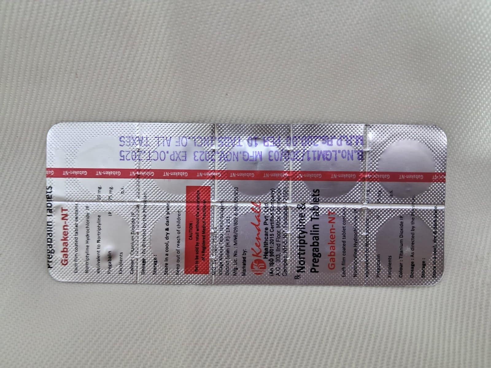 GABAKEN-NT Tablet is a powerful combination of Nortriptyline (10mg) and Pregabalin (75mg) formulated to provide long-lasting relief from neuropathic pain and related nerve disorders. This dual-action formulation targets the root cause of nerve pain by stabilizing overactive nerves and improving the transmission of nerve signals.