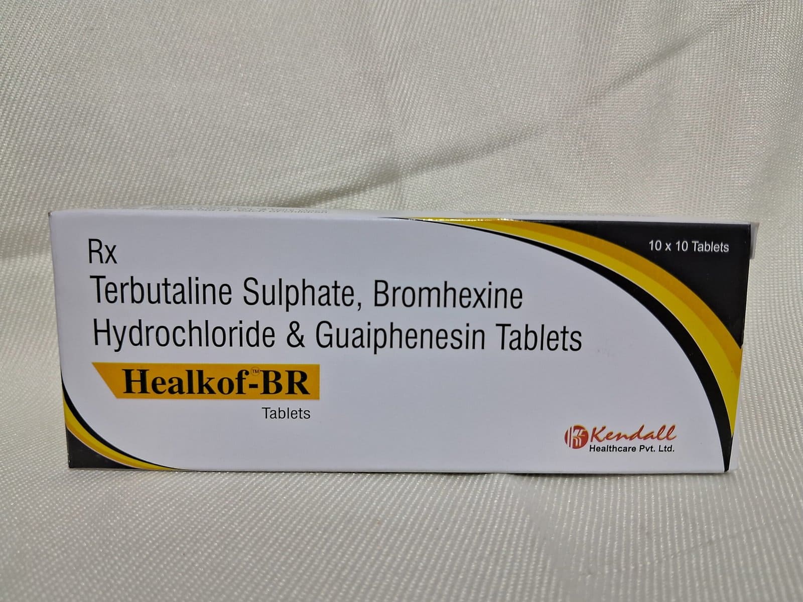 HEALKOF-BR Tablet is a powerful combination medicine formulated to provide effective relief from cough, bronchitis, and respiratory congestion. It contains Terbutaline (1.25mg), Bromhexine Hydrochloride (8mg), and Guaiphenesin (100mg) — three well-known active ingredients that work synergistically to improve respiratory comfort and ease breathing.