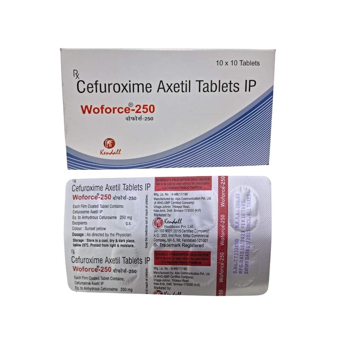 WOFORCE-250 Tablet contains Cefuroxime I.P. 250 mg, a broad-spectrum second-generation cephalosporin antibiotic that provides powerful protection against bacterial infections. It works by inhibiting bacterial cell wall synthesis, leading to the destruction of harmful bacteria responsible for various infections.